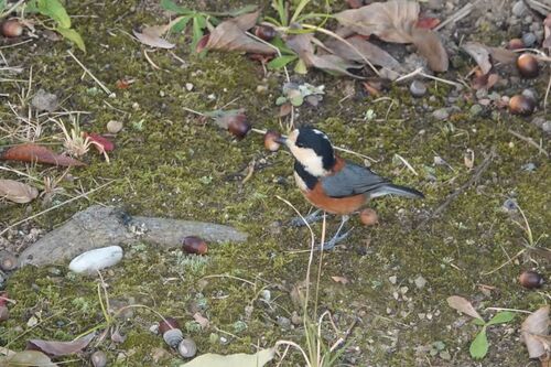 朝、メダカさんにご飯をあげていましたら ヤマガラさんがやってきました… ドングリがいっぱいだね♪ チャッ チャッ チャッ と 笹鳴きのウグイスさん 手前の木のすぐ右側の真ん中あたりに 上を向いています しょうもない写真ですが こんな感じでいたよ♪という…
