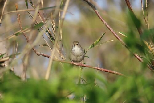 笹藪のウグイスさん 喉を膨らませて いい声を 聴かせてくれました♪ 時々 メジロさんをウグイスさんだと 勘違いされている方がいらっしゃいますが こちらがほんとうのウグイスさんです(^o^) (埼玉県 4月5日)