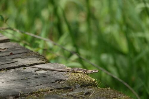 苔むす 木道で カナヘビさんを見かけたよ♪ ねえねえ アナグマさんは来たかしら? 一度だけこの場所で アナグマさんに出会いました 再会を期待していますが まだ叶ってはいません (埼玉県 4月26日)
