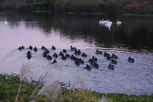 コハクチョウさんを訪ねたのは もう 日暮れ時 ほんのりと オレンジ色に染まるなか 左の方に写っているのは富士山です そろそろ お休みの時間のようです そんなとき オナガガモさん達が隊列をなして ぐんぐん泳いできて コハクチョウさんの横を 通り過ぎてゆ…
