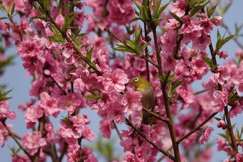 花桃の中からメジロさんにゅっと出た青空の下で思わず歌いたくなっちゃう♪お花の蜜は美味しいしこんなに いいお天気なんだもの見てたの~可愛く撮ってくださいねそのままでじゅうぶん かわいいよ春は嬉しいね!🌸(古河公方公園にて 3月27日)
